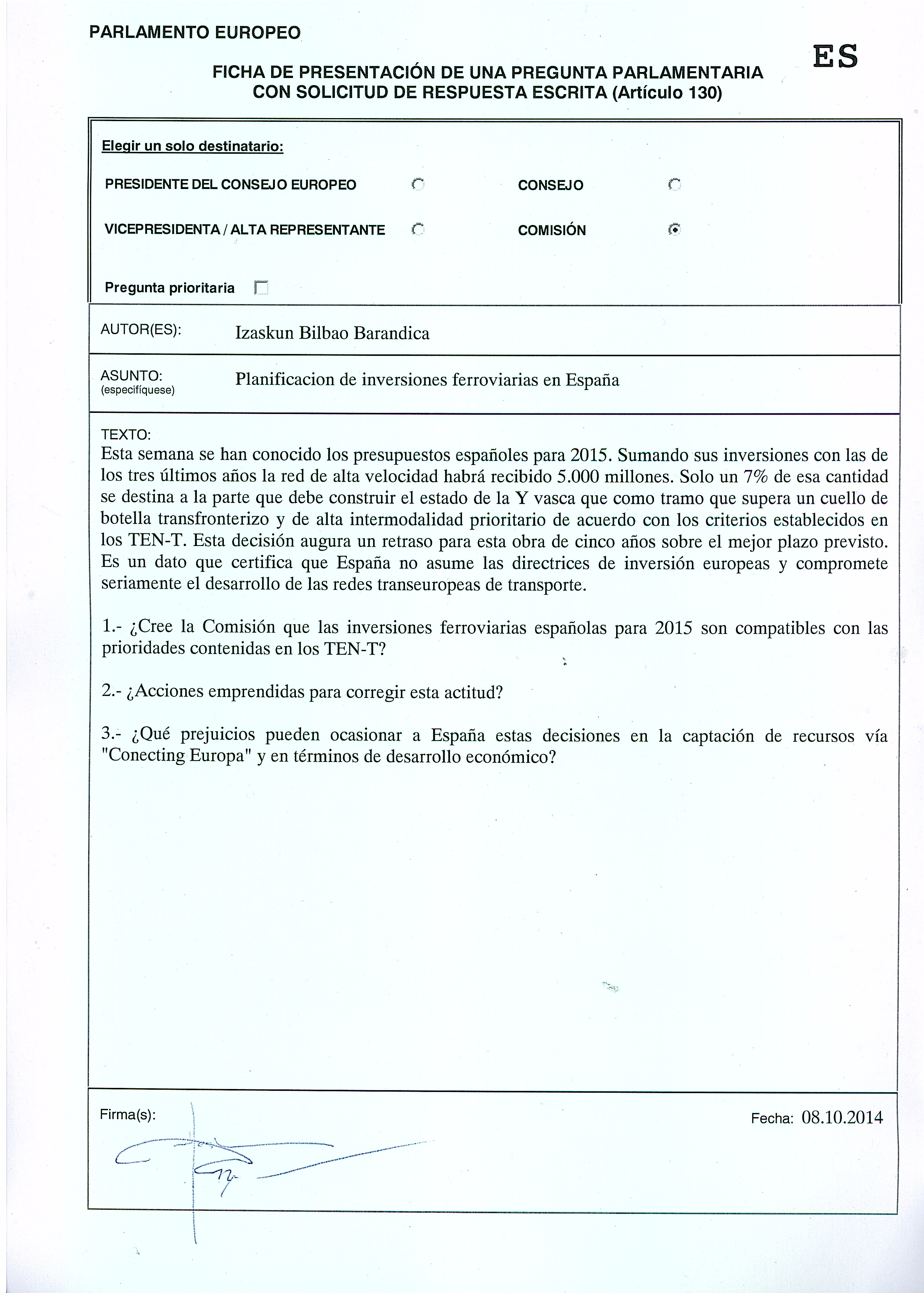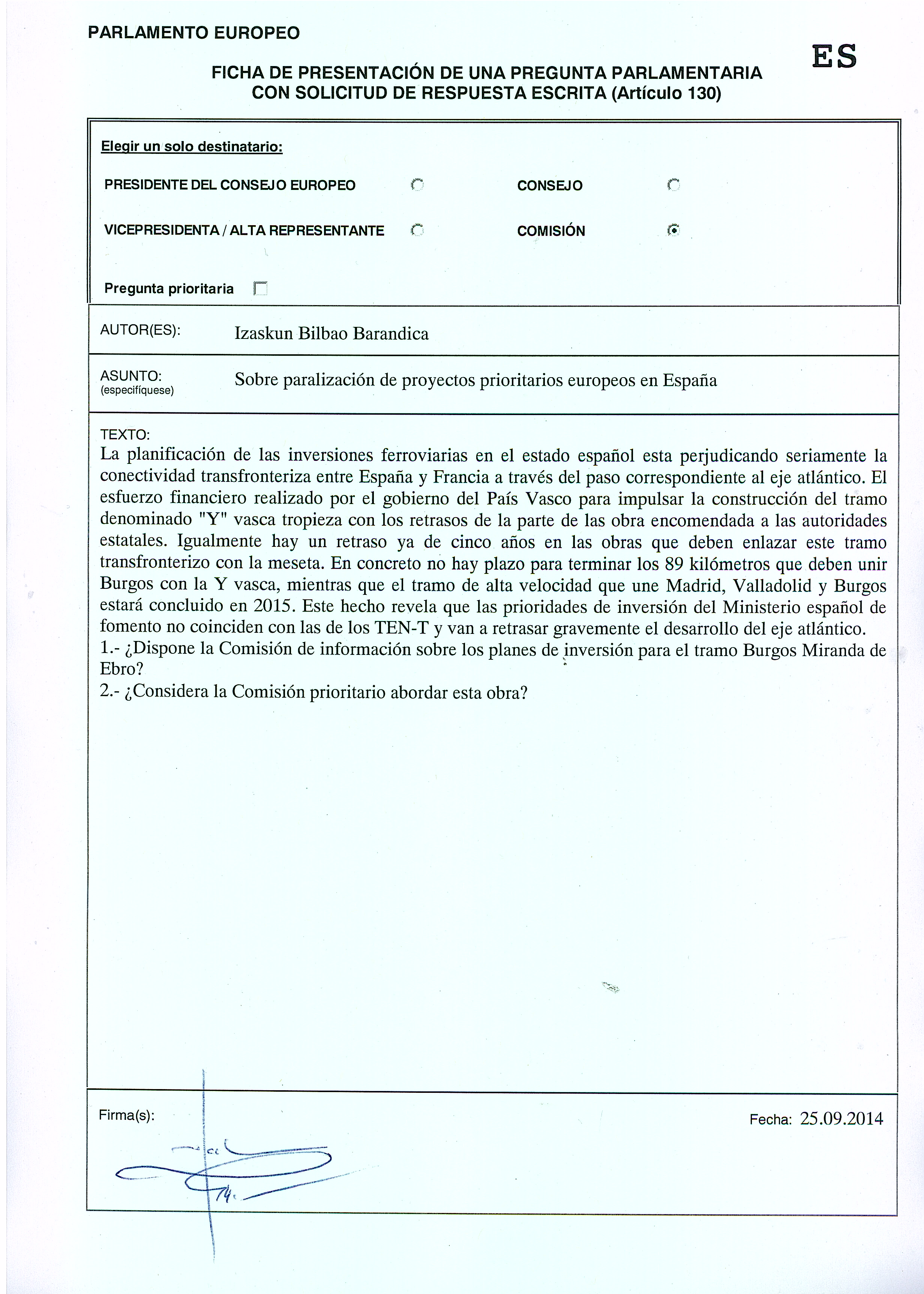 La pregunta de la eurodiputada jeltzale Izaskun Bilbao Barandica se combina con otras dos iniciativas destinadas a recabar la opinión de la Comisión Europea sobre los retrasos que acumula la construcción del Eje Atlántico entre Burgos y Miranda de Ebro y los que afectan a la propia Y vasca que se han visto confirmados por las inversiones consignadas en los presupuestos españoles para 2015.